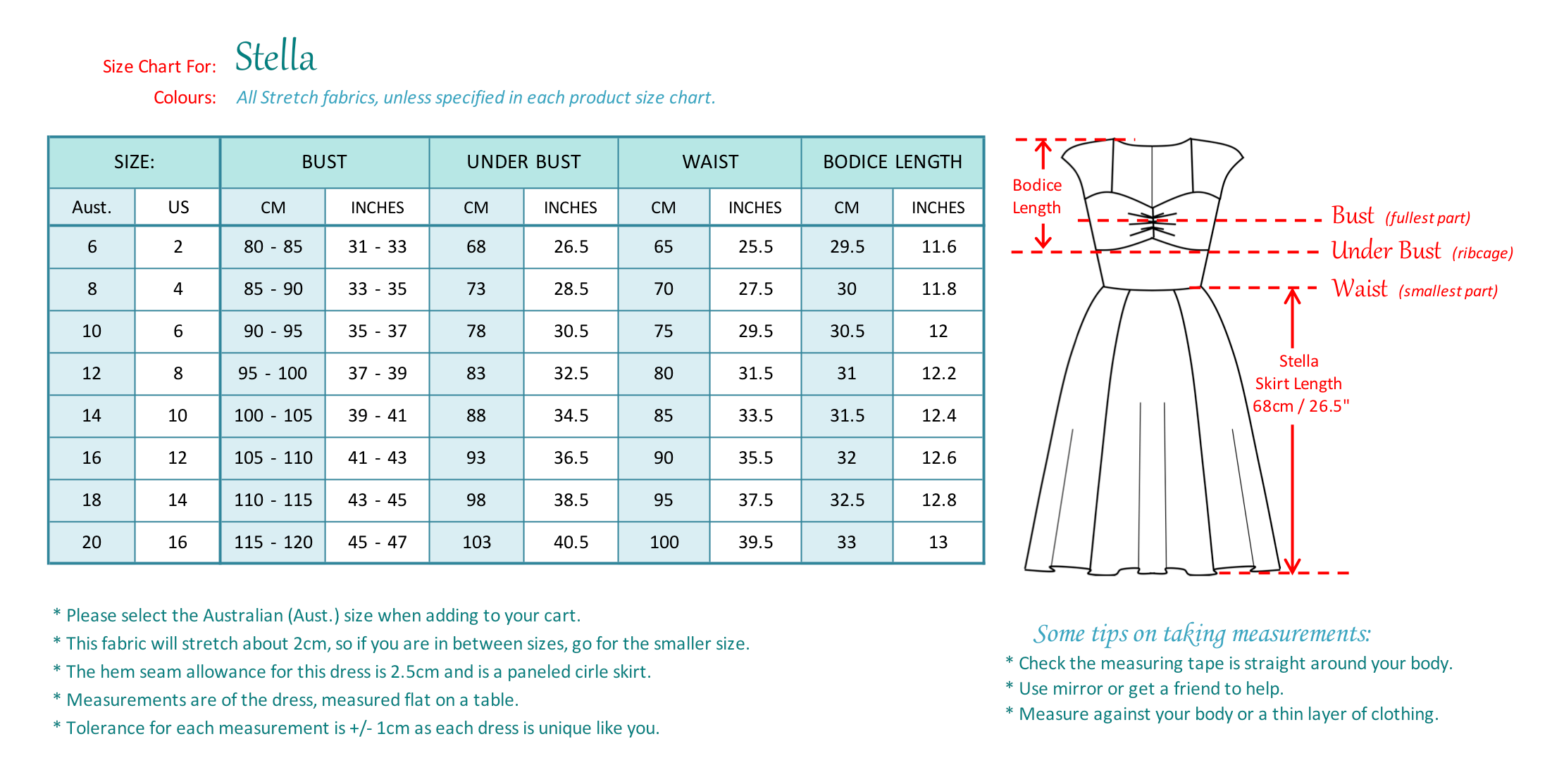 The Stella has a flattering sweetheart neckline, tucks at the centre front bust seam, a fitted waistband and extended shoulder cap sleeve. The panelled flared skirt is perfect for those who prefer no tucks and has side seam pockets.